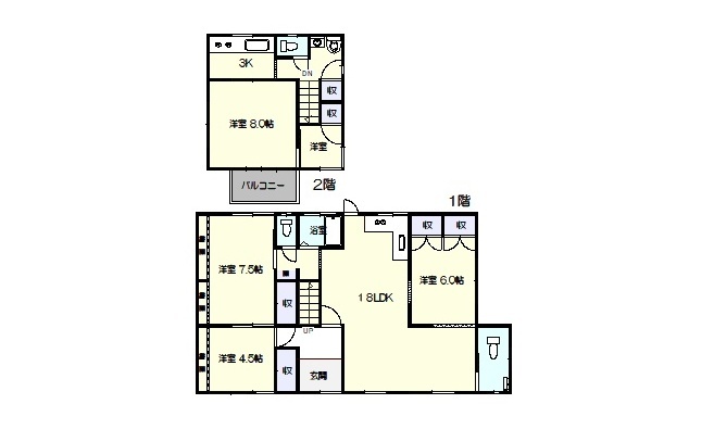 間取り | 2階 洋8 3k WC 1階 洋7.5 洋6 洋4.5 LDK18 WC |